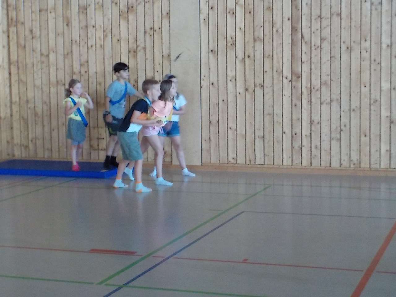 Zum Ofschloss hunn mer dann alleguer zesummen, dobaussen um Atelier ,,Gladiatoren‘‘ deelgeholl, wou et drëms gaangen ass op engem Balken ze balancéieren an déi aner Kanner probéieren dovun erof ze geheien.