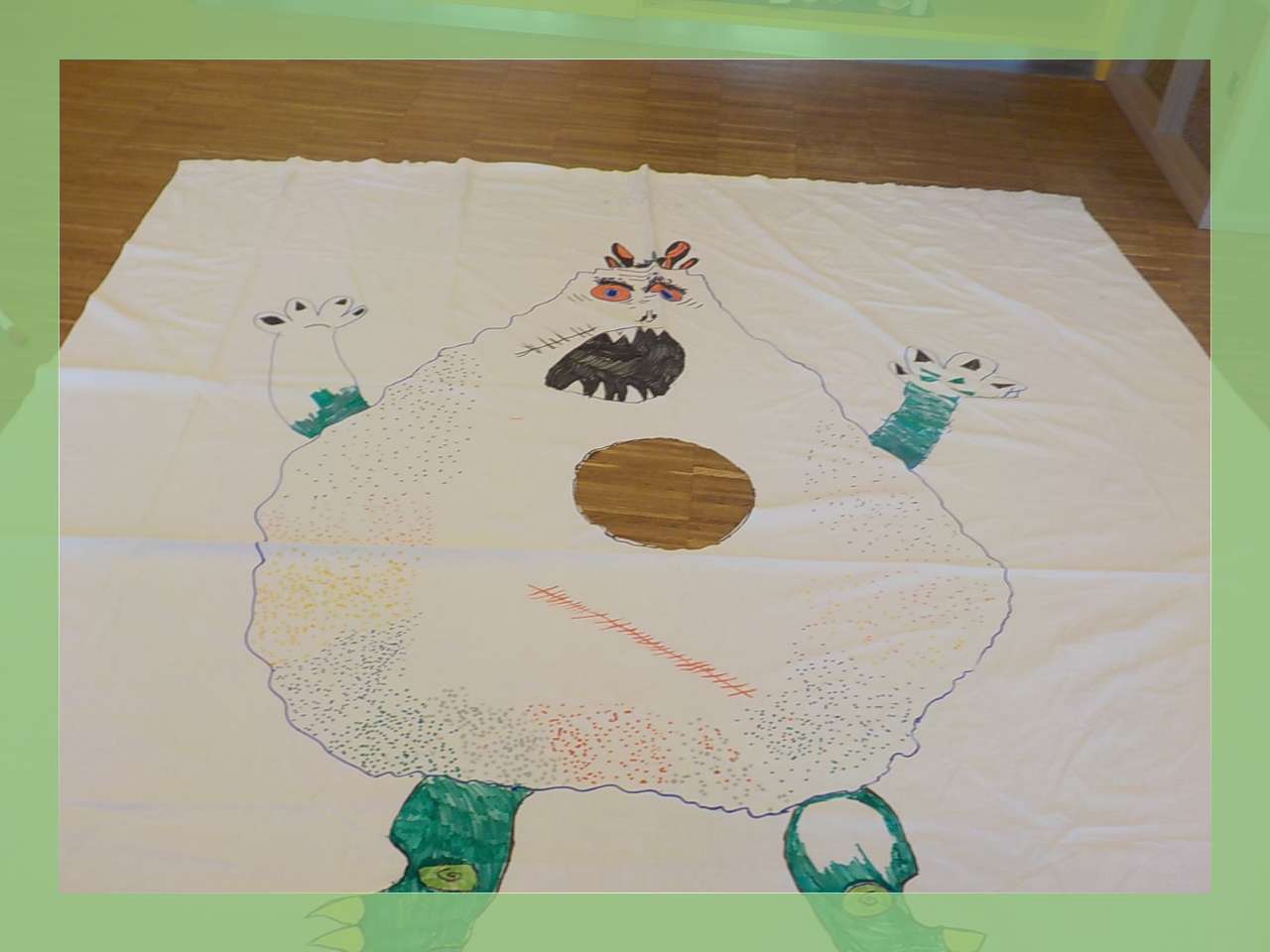 D'Kanner sollen gemeinsam een grousst Sockenmonster op d'Léihnduch molen, dobäi sollen d'Kanner sech ënnerteneen eens gi, wien wat genau moolt, dobäi ass et wichteg dat si mateneen kommunizéieren an ënnert Ëmstänn och Kompromësser aginn. Dobäi sollen hir sozial Kompetenzen an hirer Kommunikatiounsfäegkeet am Grupp gestäerkt gi.