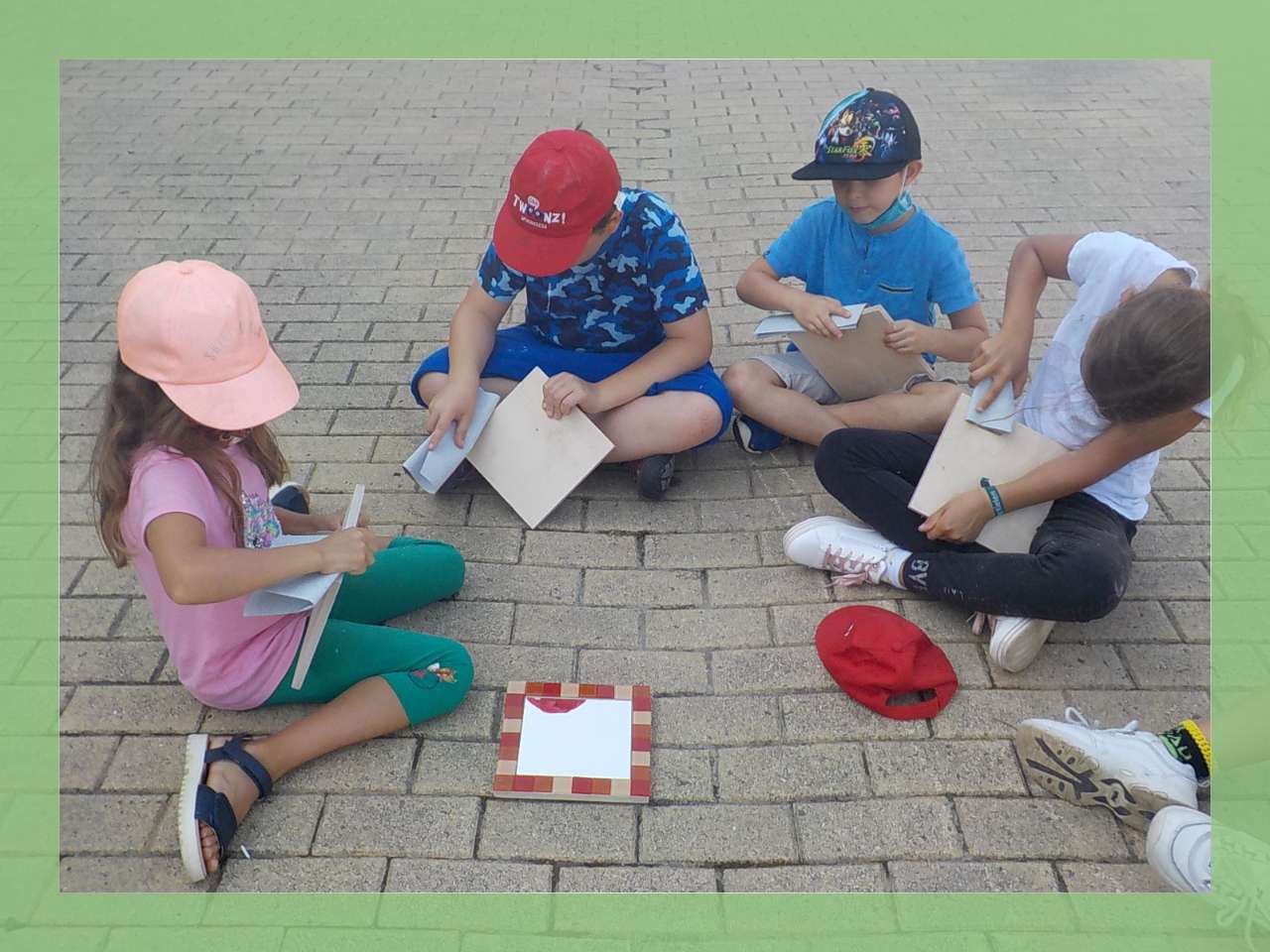 Ich zeige den Kindern meinen Selbstversuch (eines Mosaikspiegels) und erkläre ihnen die jeweiligen Arbeitsschritte. Jedes Kind bekommt sein Material: eine Holzspannplatte und einen Spiegel. Ich erkläre den Kindern, welches Material wir benutzen, um die Mosaiksteine „anzukleben“ und danach können die Kinder beginnen mit der Fugenmasse, die Mosaiksteine an Ort und Stelle zu platzieren.
