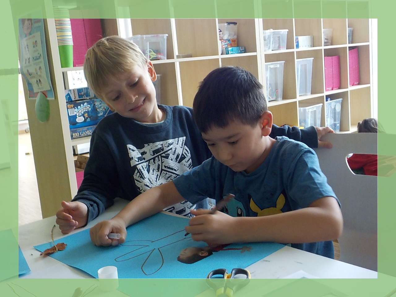 Déi  gedréchent Blieder hunn mir dann benotzt fir ze bastelen. Als éischt gouf vun all Kand eng Foto gemaach, wou d'Kanner sou maachen wéi wann si eppes geiffen fort blosen. Déi Kanner vun deenen keng Foto däerf gemaach ginn, hunn sech als Alternativ dozou selwer gemoolt. D'Foto (bzw. dat gemoolten Bild) hunn d'Kanner dunn eraus geschnidden an op en Blat gepecht. Doropshin hunn si dann déi gesammelt Blieder nach opgepecht, dass et sou ausgesäit wéi wann si déi geiffen fortblosen.