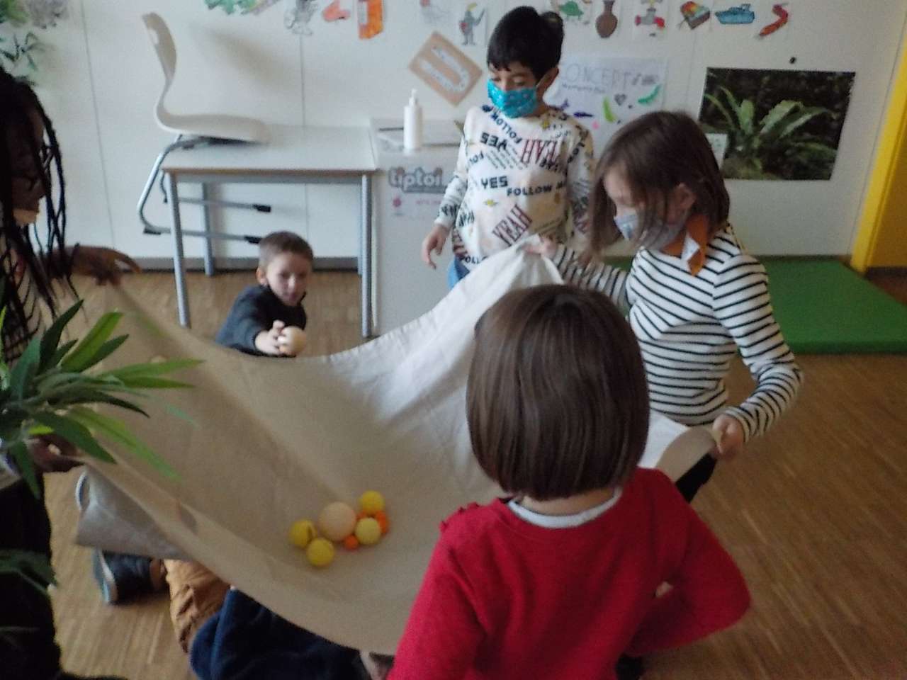 Hunn mat den Kanner een "Spillfeld" gebastelt, wat aus engem Läinduch besteet. Op all Eck gëtt een Laach dran geschnidden vun verschiddenen Gréissten. Ronderëm all Lach gëtt mat enger anerer Faarw gemolt. Am beschten eng Kürbisfarw (orange, beige, hell orange,...) oder eng aner Hierschtfaarw (rout,brong,...). Dann huelen mer an deenen selwechten Faarwen, ewéi Lächer hunn, Bäll. Wann mer z.B. Orange, beige, rout an brong Lächer hunn, huelen mer Stiroporbullen, di mir an deenen selwechten Faarwen molen. Deenen molen mer dann och nach een schéinen Kürbissmond. Dann geet et dreems, dat een zuzwee dat Läinduch unhält an probéiert zesummen, d.h. an Teamaarbecht, dei faarweg Bäll an dat deementspriechend passend faarwegt Lach ze rullen. Een orangen Ball soll och an dat orangt Laach gerullt gi. Wann een Ball an een anert Lach rullt gëtt den Ball erëm op Spillfeld gemaach an si kennen et nach eng kéier probéieren. Dat Team wat Bäll an déi richteg Lächer gerullt huet, huet gewonnen. Sie sollen zesummen mathelef vun gudder Koordinatioun an Taktik Kürbisse versenken. Wann Kanner Loscht hunn, kann den Spillverlaf och mat enger Stoppauer begleet gi. Esou huet herno dat Team gewonnen, wat am séiersten Kürbissbäll an déi richteg Lächer gemaach huet. Esou leieren se, dat dat Spill, an och nach aner Saachen, mei einfach ze léisen sinn, wann een deem aneren nolauschtert, wann een zesummeschafft an wann een sech ofschwätzt.